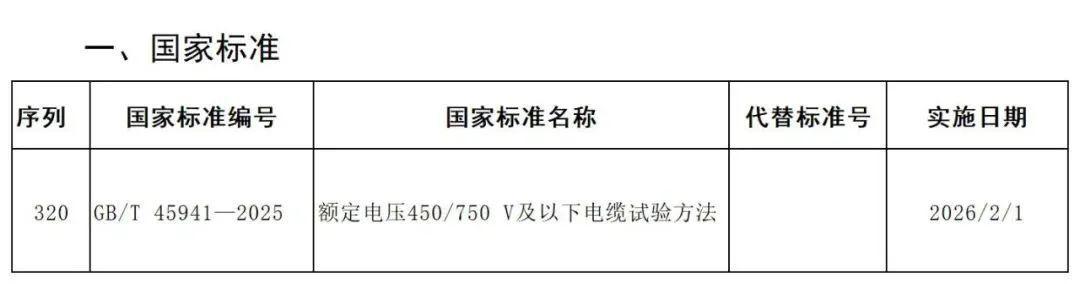 近日,国家标准化管理委员会官网发布了2025年第19号关于批准发布《钢板和钢带包装、标志及质量证明书的一般要求》等416项推荐性国家标准和3项推荐性国家标准修改单的公告,跟电缆相关的有批准发布GB/T 45941—2025《额定电压450/750V及以下电缆试验方法》,实施日期为2026年2月1日。